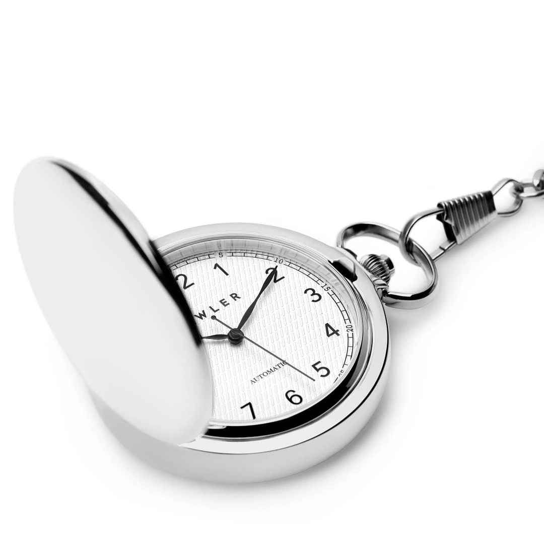 Son couvercle en acier inoxydable poli est décoré de détails de finition complexes sur sa face interne. Son cadran blanc texturé contraste avec les aiguilles noires classiques, pour vous permettre de lire l’heure en un coup d’œil.