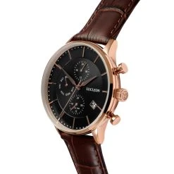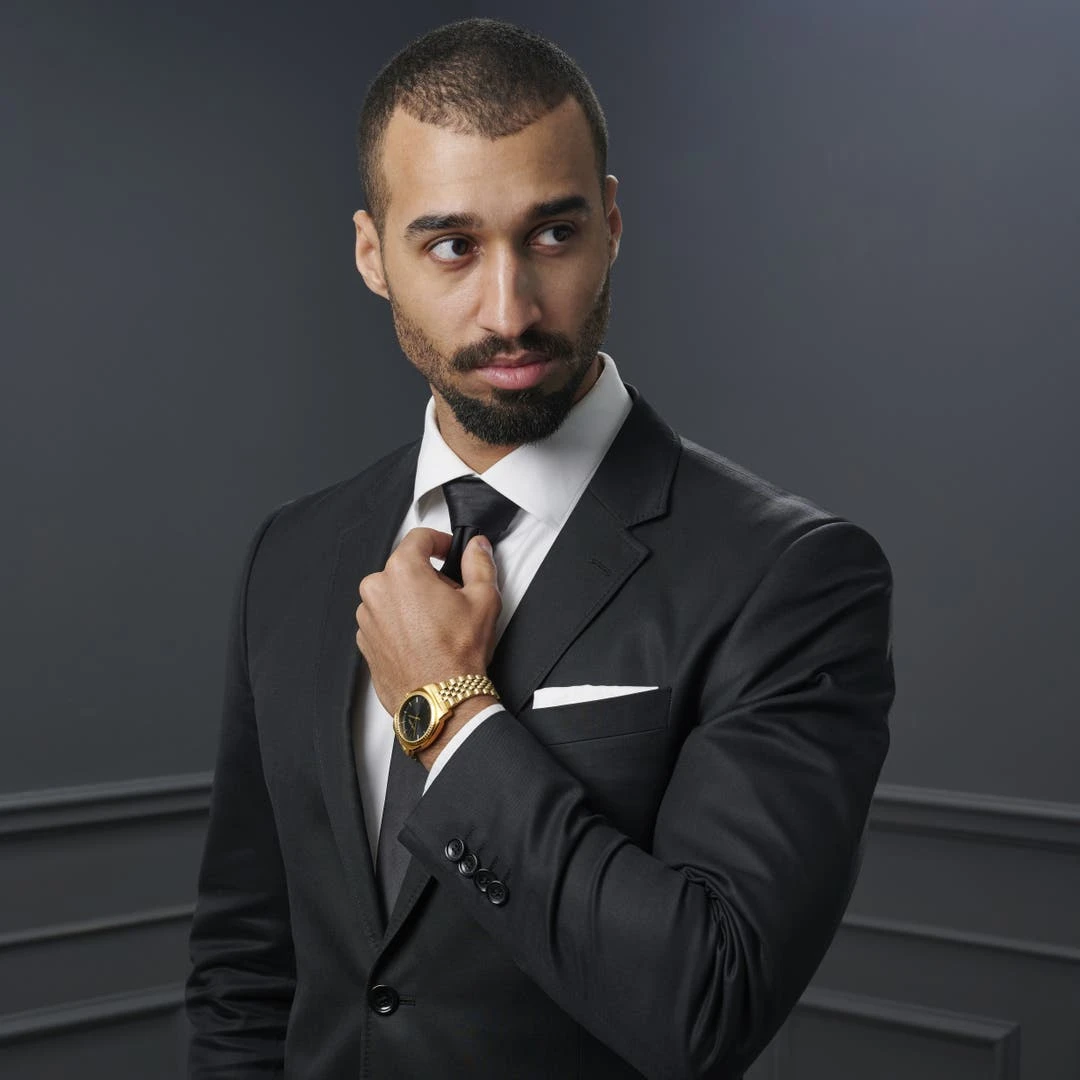 Son élégant cadran sombre contraste merveilleusement avec l’acier inoxydable rutilant de son boîtier. Un bracelet en acier inoxydable doré assorti à ce boîtier vient compléter ce design 100% classique.