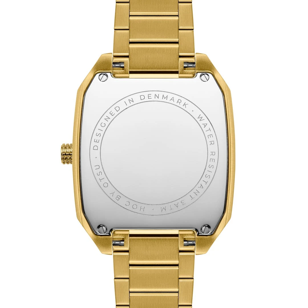 Sa couleur dorée est obtenue en appliquant du nitrure de titane à sa surface à l’aide d’un revêtement PVD, une méthode écologique qui minimise les déchets et élimine les déversements toxiques. Le nitrure de titane fusionne avec le métal au niveau moléculaire et possède une microdureté de 2400 HV, rendant cette montre pour homme résistante aux rayures et lui donnant une magnifique finition brillante qui ne se décolore pas et ne s’écaille pas.