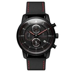 Fabriquée en acier chirurgical, le boîtier de 40 mm affiche un cadran de couleur gunmetal, mis en valeur par des accents rouge vif et 3 sous-cadrans ainsi qu’une fenêtre à affichage de la date.