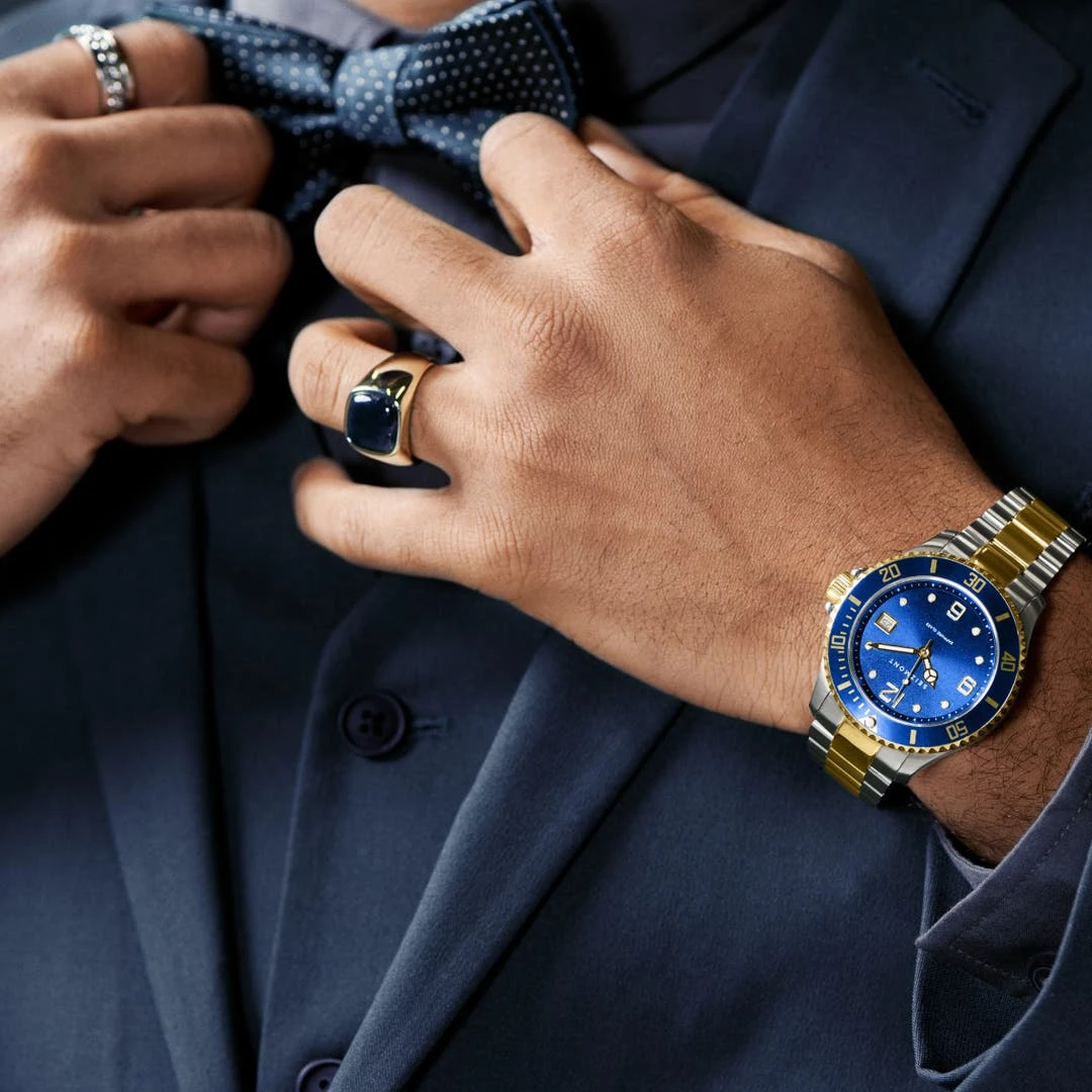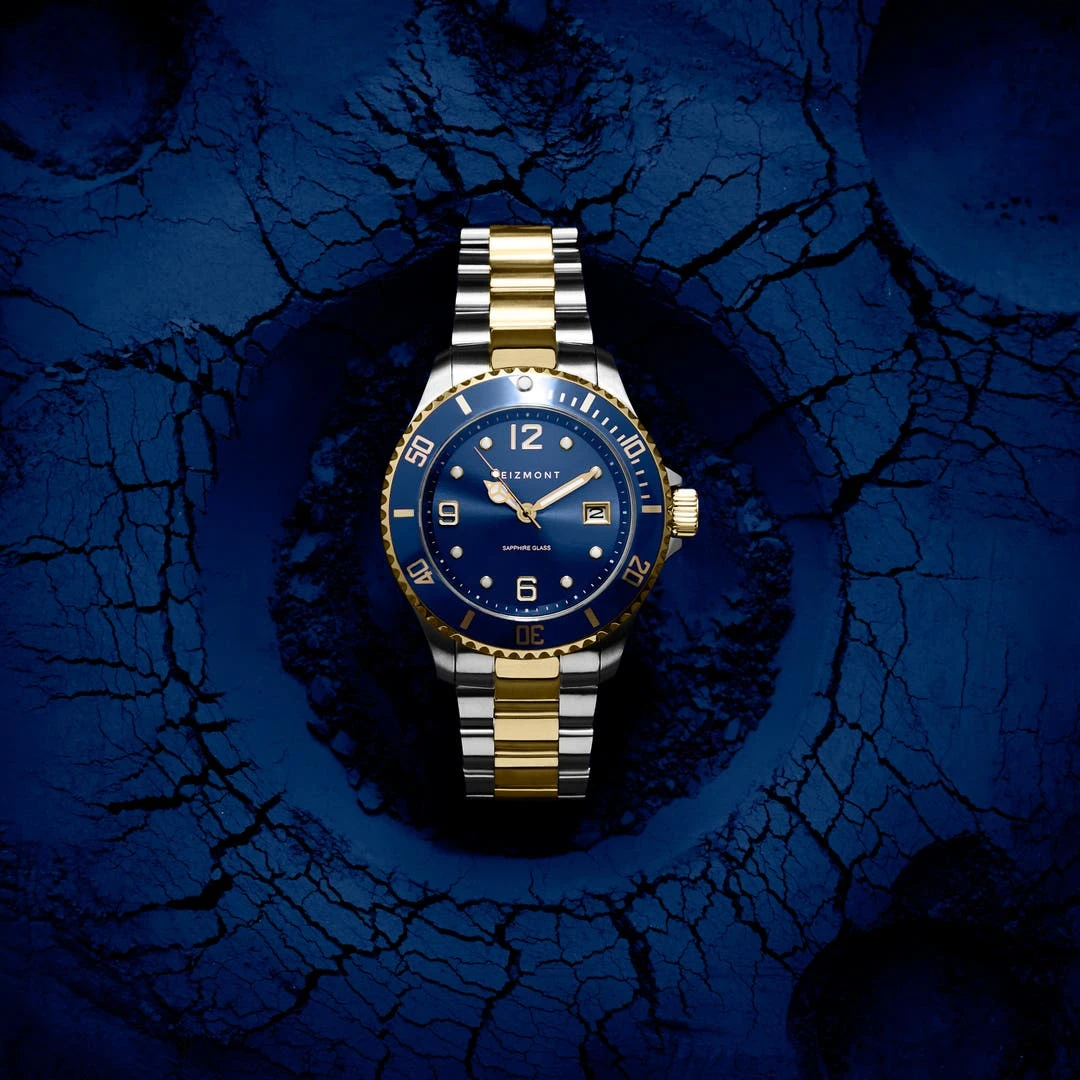 Cette montre pour homme de couleur bleue, argentée et dorée est fabriquée avec un mouvement à quartz Miyota 2315 fiable et conçue en acier inoxydable de qualité chirurgicale avec un verre saphir résistant aux rayures.