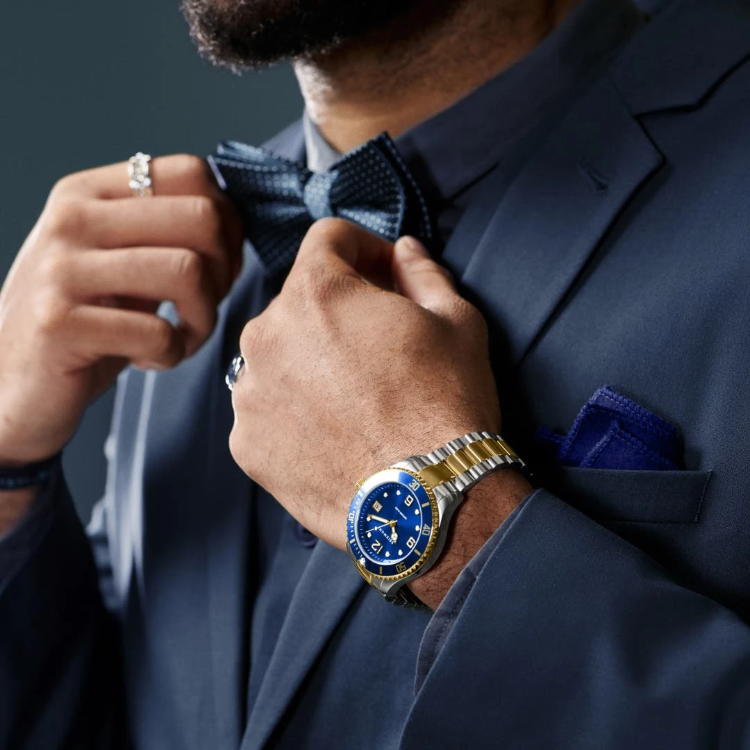 Le cadran bleu est logé dans un boîtier doré de 42 mm et orné d’aiguilles et de marqueurs luminescents, ainsi que d’une lunette graduée assortie. La fenêtre de date est bien placée et vous permet de vous situer dans le temps en un clin d’œil.
