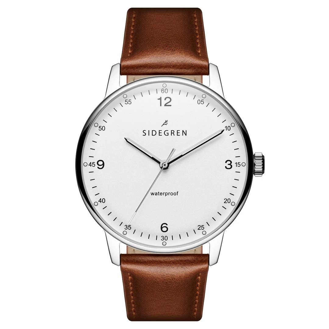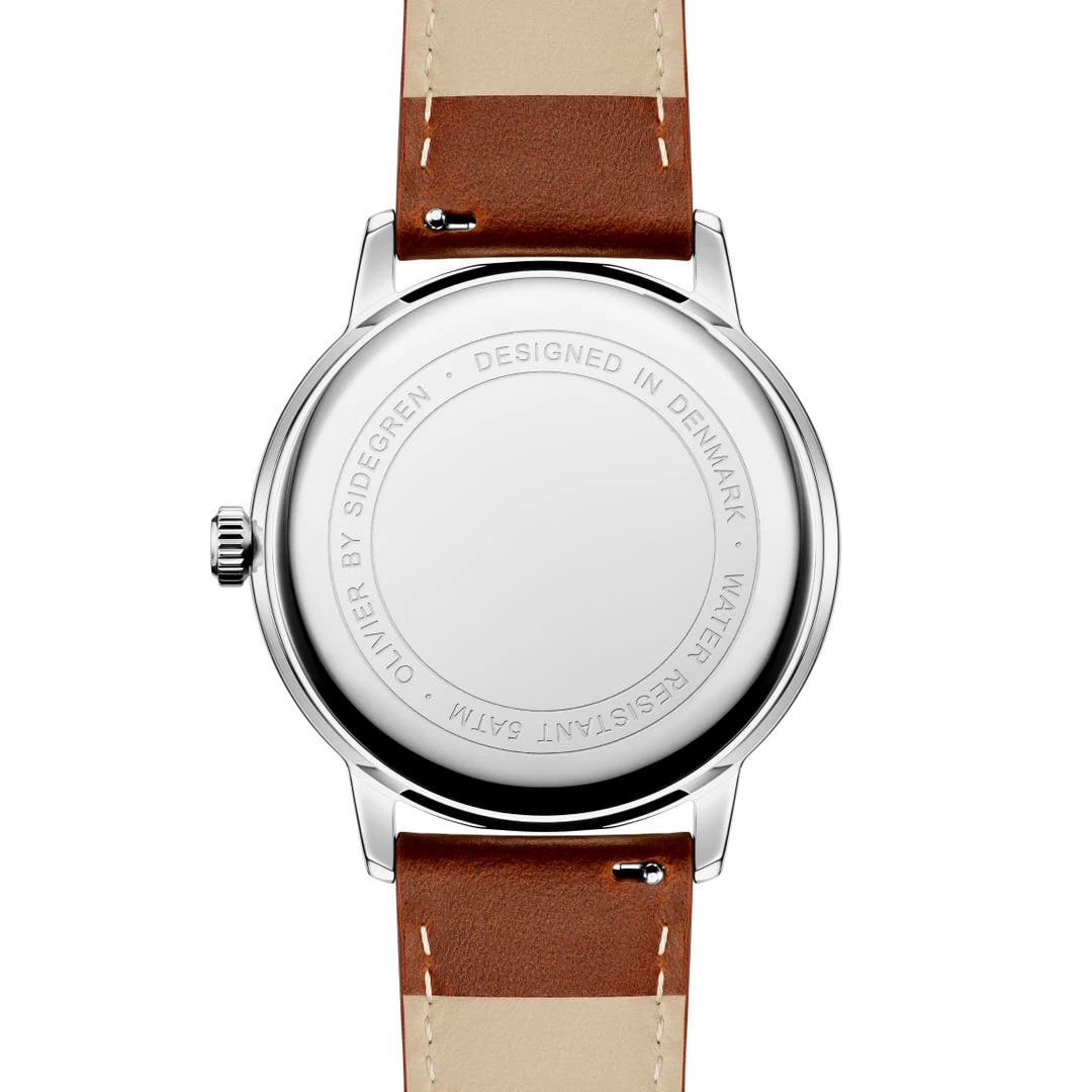 Le boîtier en acier inoxydable chirurgical abrite un mouvement Seiko d’une grande fiabilité. La finition argentée polie se marie à merveille avec le bracelet classique brun cognac. Fabriqué en cuir véritable, celui-ci gagnera en beauté au fil du temps et se ferme à l’aide d’une boucle à ardillon sécurisée. Ce bracelet sera facilement interchangeable sans outil grâce à ses barrettes à dégagement rapide.