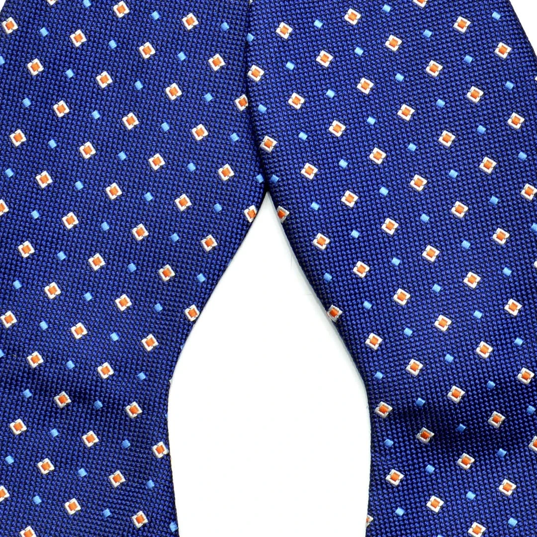 Voici un nœud papillon bleu royal avec des détails à pois oranges encadrées de carrés blancs et complétés par des pois bleu clair pour un look classique et harmonieux.