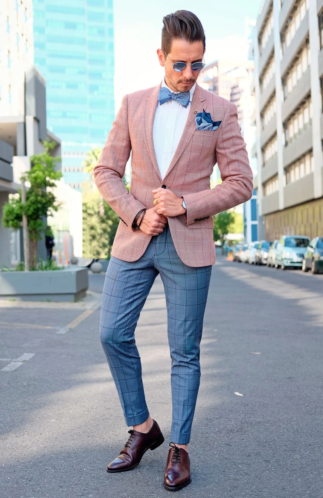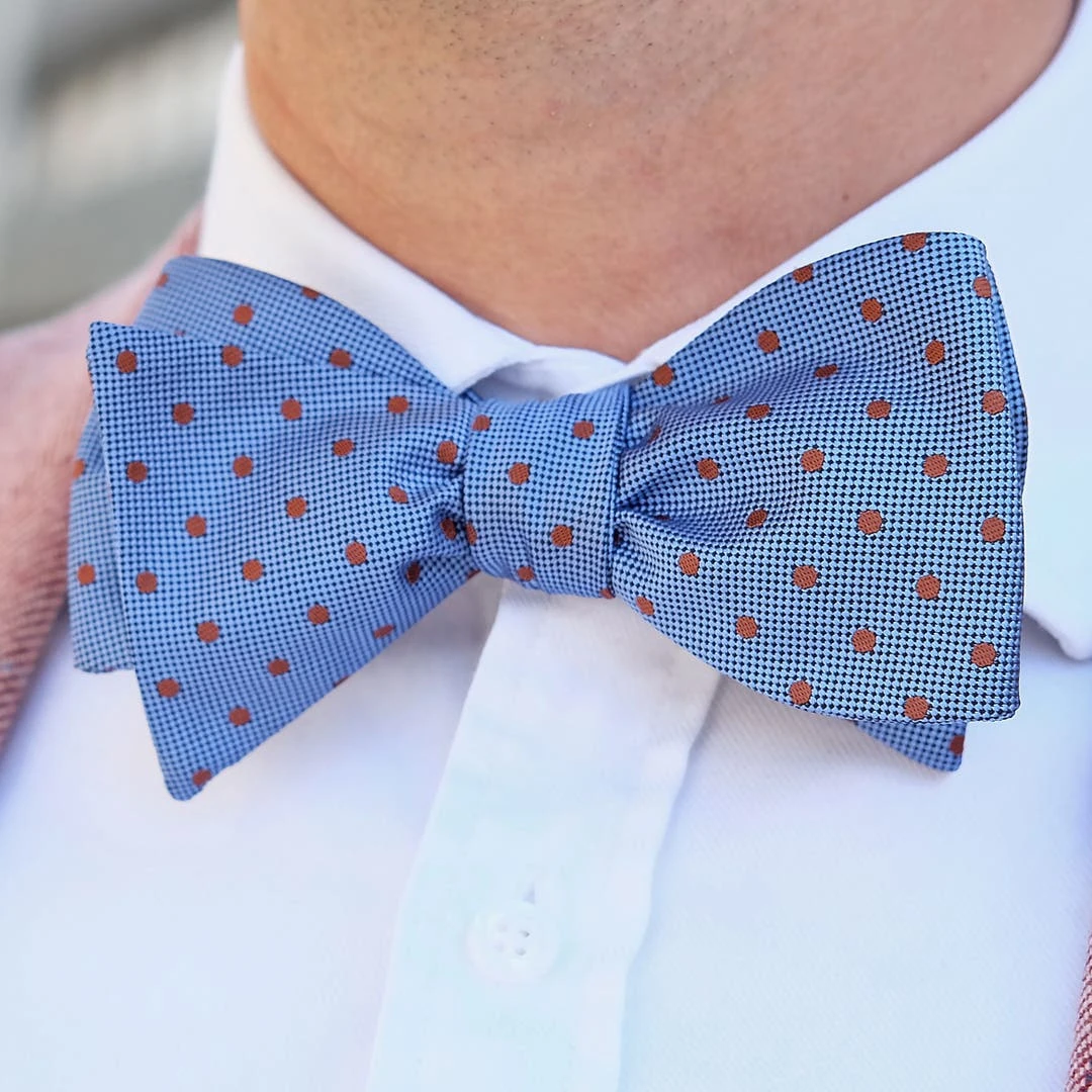 Un nœud papillon à nouer au look frais, parfait pour les journées ensoleillées et les nuits chaudes. Il possède un fond en deux nuances de bleu et de petits pois bruns pour faire un design aux couleurs parfaitement équilibrées.