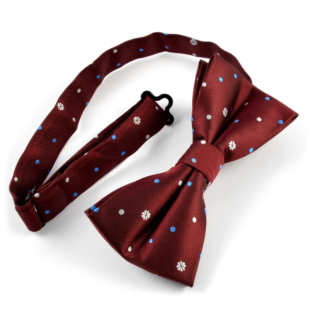 Les petits points blancs et bleu ciel et les micro fleurs blanches égaient ce nœud papillon bordeaux classique.