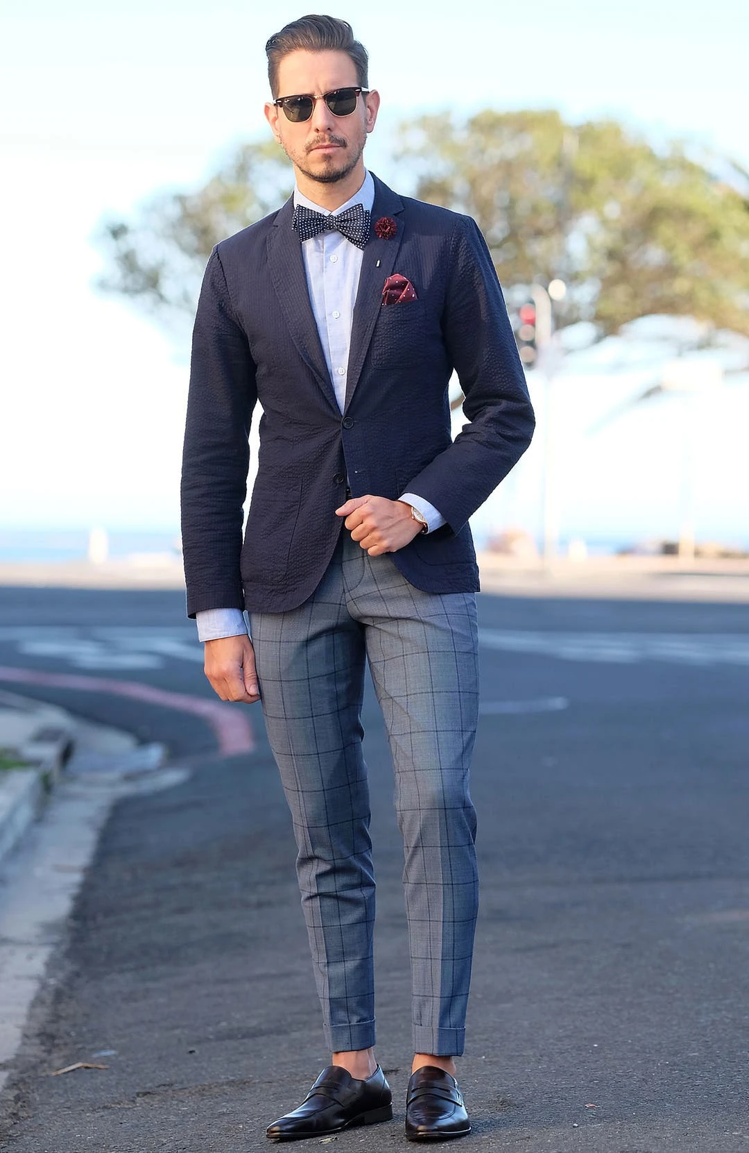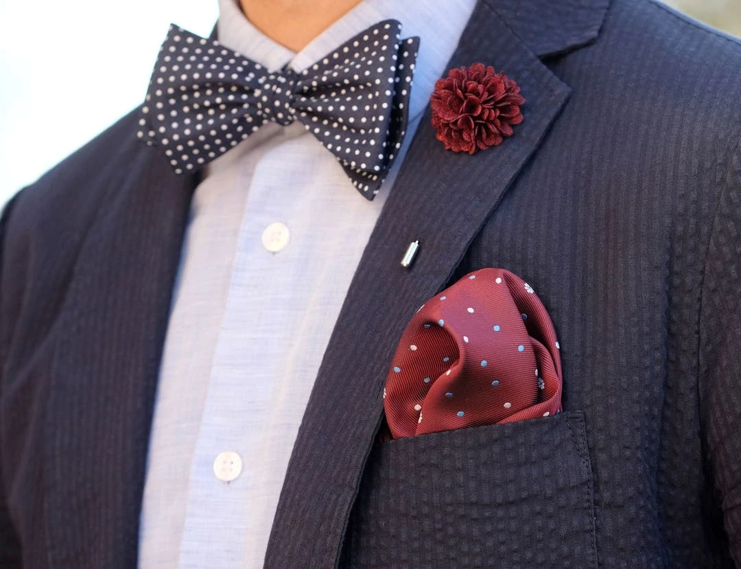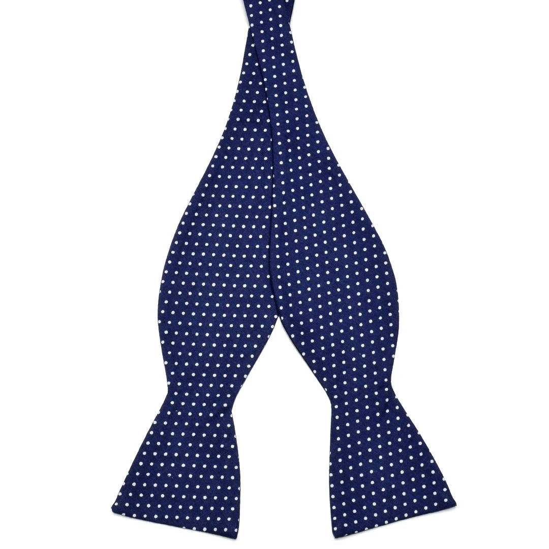 Ce modèle affiche un motif à pois blancs sur un tissu en coton bleu marine. Il fera un effet bœuf avec votre costume gris, noir ou marron et presque toutes les couleurs de chemises.
