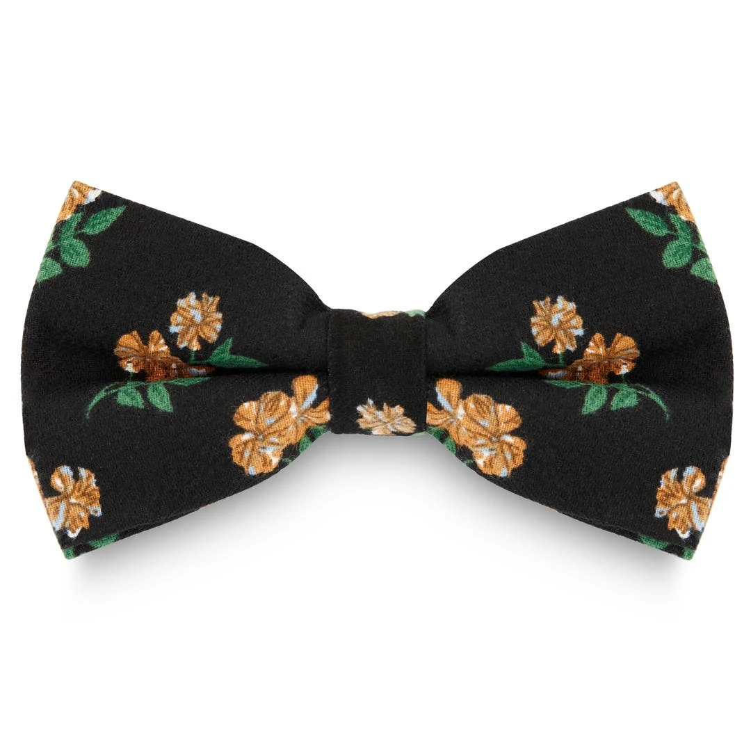 Un élégant nœud papillon noir décoré d’un subtil motif à fleurs orange.