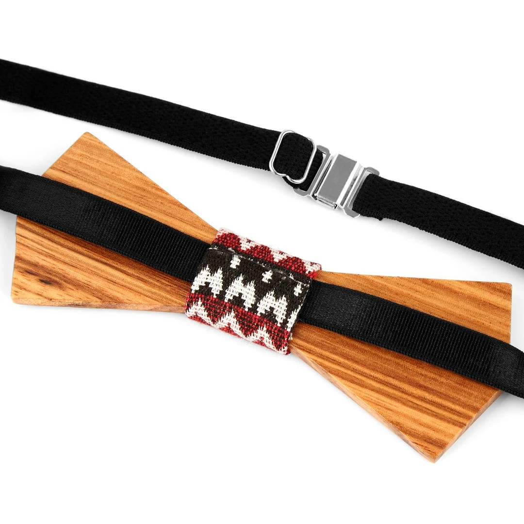 Épatez votre entourage à l’aide cet admirable noeud papillon hyper stylé. Taillé dans le bois de zebrawood, ce noeud papillons aux extrémités pointues est décoré d’une pièce de tissu à motif tribal et d’une sangle élastique réglable en longueur. Le compagnon parfait de vos tenues décontractées (voire désinvoltes).