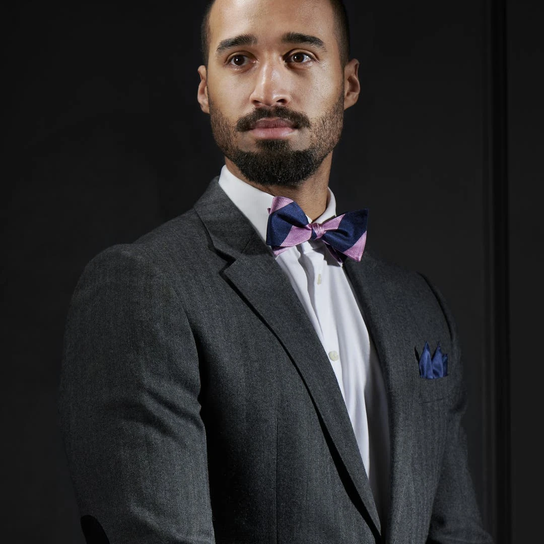 Ce magnifique noeud papillon bleu marine est orné de rayures roses, parfait pour peaufiner votre look de dandy cool.