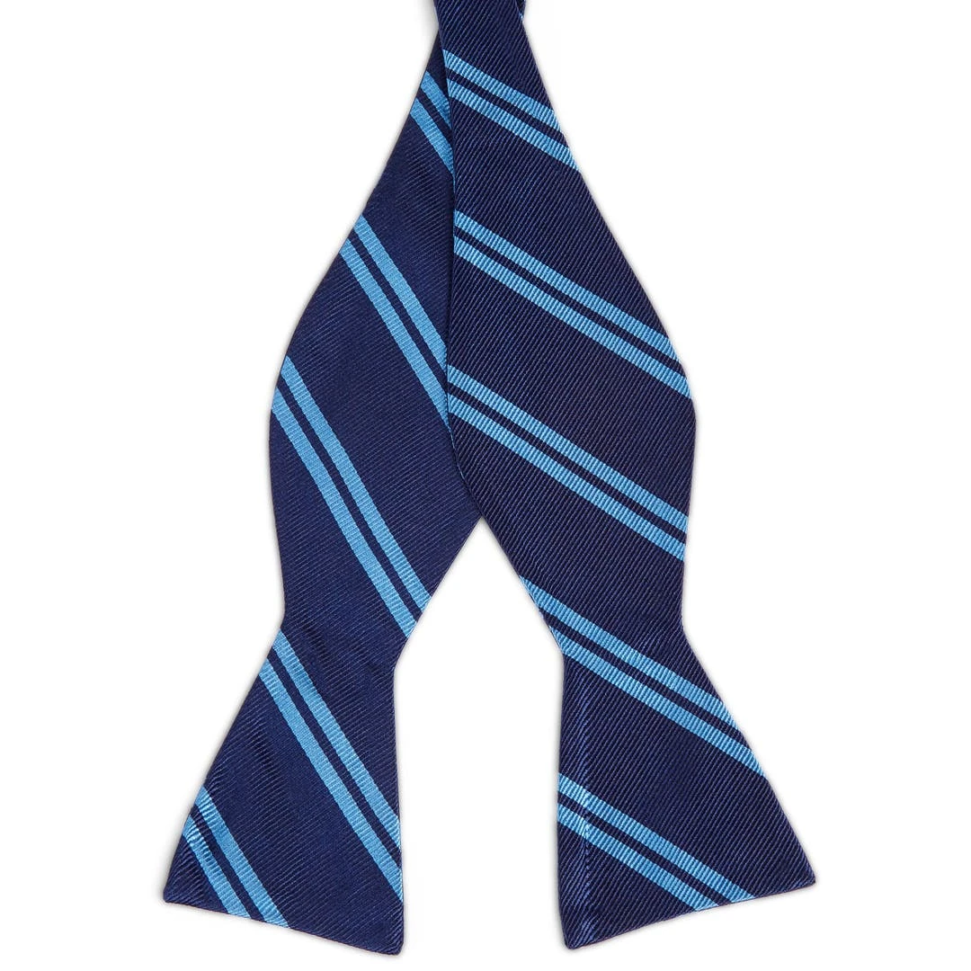 Ce noeud papillon de haute qualité arbore des rayures bleues métal sur un fond marine, un résultat tout en contrastes très dynamique qui ne manquera pas d’attirer les regards vers votre visage.