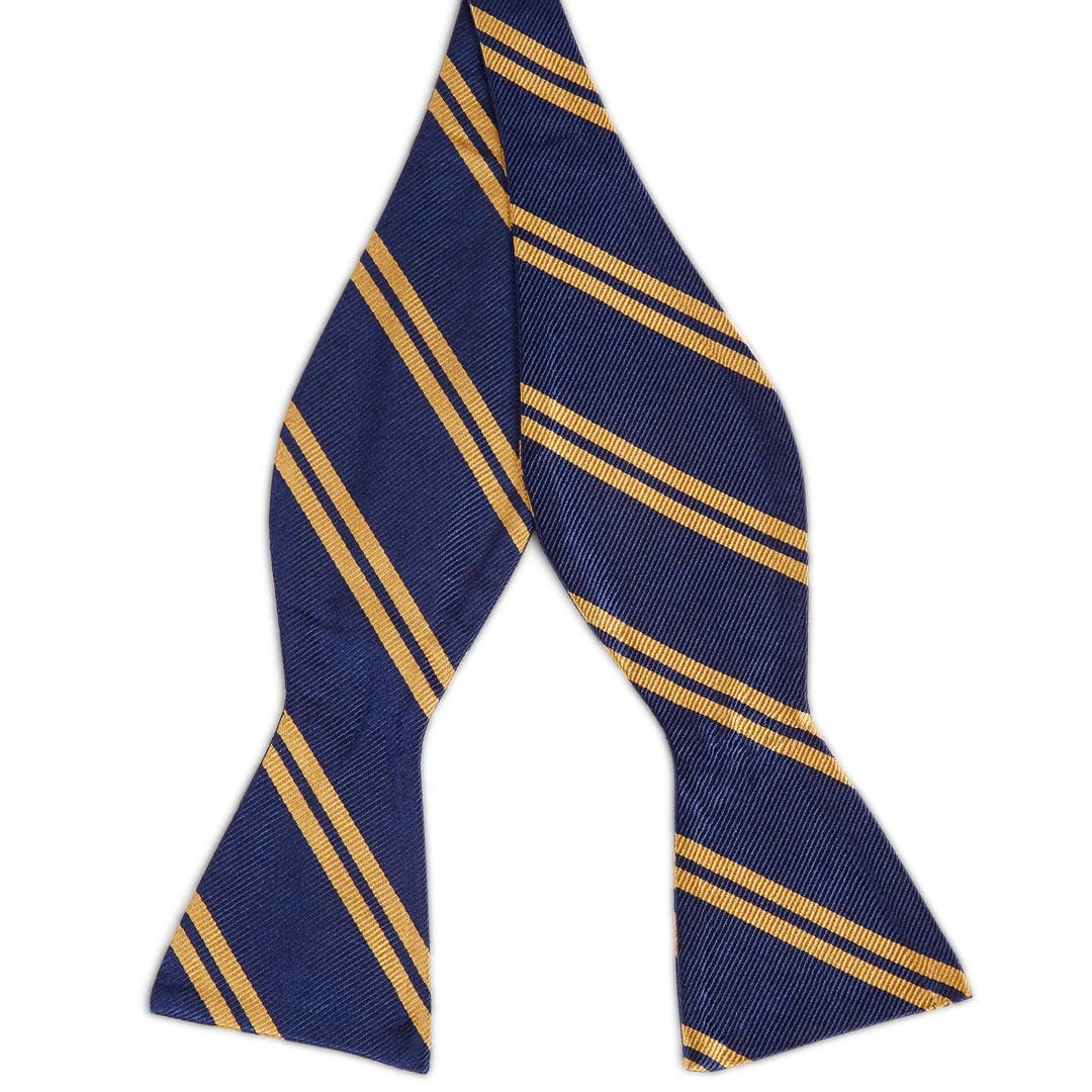 Ce magnifique noeud papillon bleu foncé arbore des rayures de couleur or qui lui procurent un style aussi élégant que luxueux.